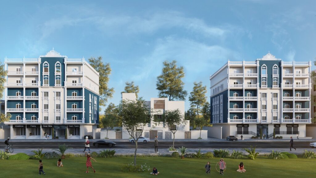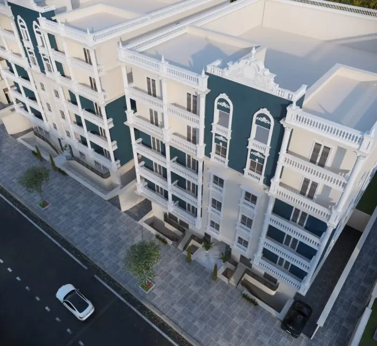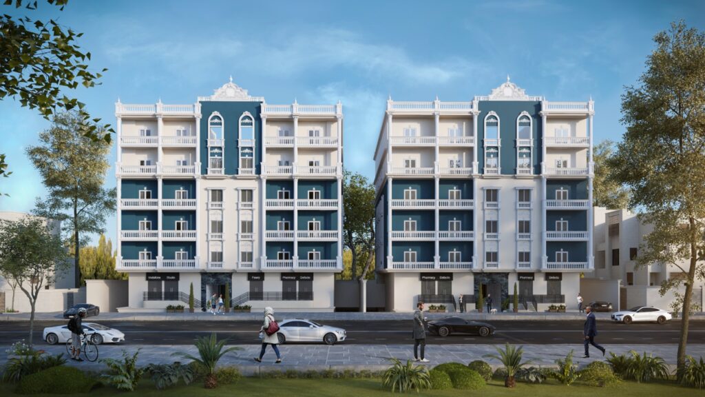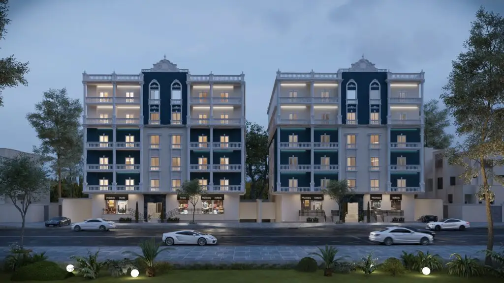 The project is distinguished by its comprehensive high-end services, including Elevators – Intercom system – phone services – Security 24/7 – surveillance system – Parkings that accommodates over 90 cars.